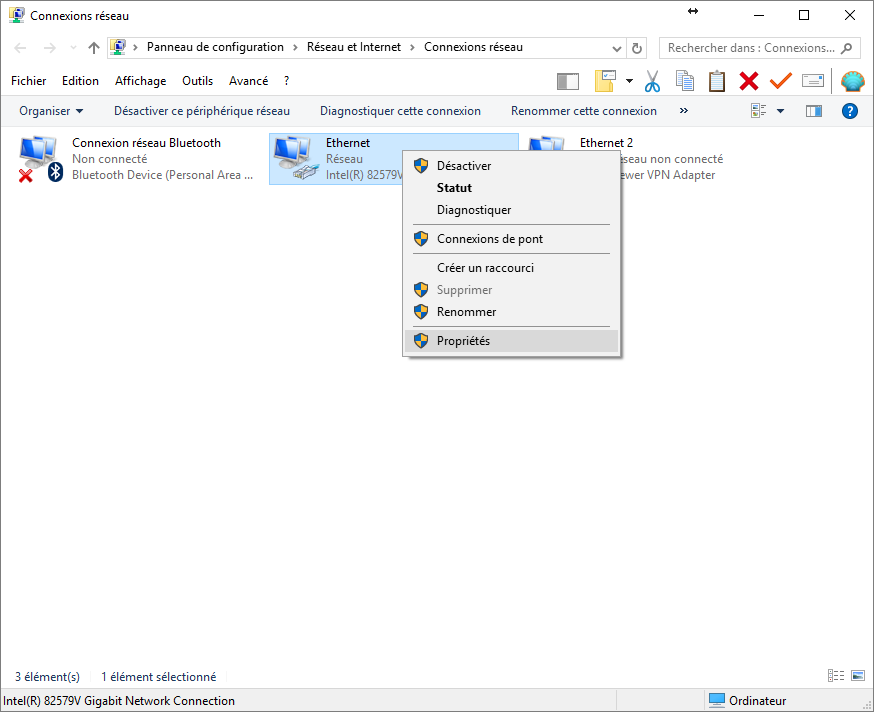 3. Faites un clic droit sur votre connexion "Ethernet" (Réseau Local câblé) ou "Wi-Fi" (Sans Fil) choisissez "Propriétés"